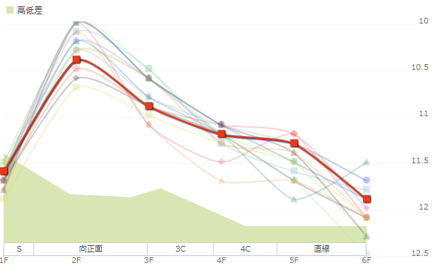 平均ラップで11秒2くらいのケースが多く、決着タイムは1分7秒3前後、上がり3Fタイムは33秒5前後になり、S値63A値63くらいになる想定。