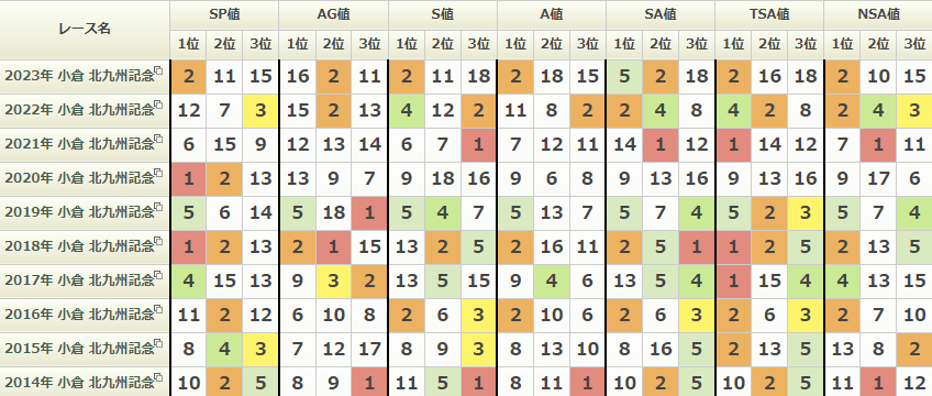 かなり荒れる傾向が強いレースです。2022年は16番人気単勝164倍のボンボヤージが勝利していて、この時は小倉巧者&51kgの軽ハンデが良かったのだと思います。 2017年は14番人気ナリタスターワンが2着、15番人気のラインスピリットが3着に入っていて前残り展開。 2014年も同じく二桁人気のメイショウイザヨイが2着、カイシュウコロンボが3着に入り、この時も前残り展開でした。 逆に2020年のアフィルアウェイ10番人気では14番手から3着に入っている。 今年は前から行ける有力馬が多いので前から行く馬は少し分が悪く、末脚鋭い人気薄を馬券に絡めてみると良いかも。 後ろから行く馬はエイシンスポッター、ヤクシマ、トゥラヴェスーラ、ディヴィナシオンあたり。 ディヴィナシオン、しばらく負けが多いですが小倉は安定して高い数値で走れているので良さそう。2022年の佐世保Sの時の数値で走れれば馬券に絡めそう。 ヤクシマも小倉で3戦2勝と得意条件なので妙味はありそう。
