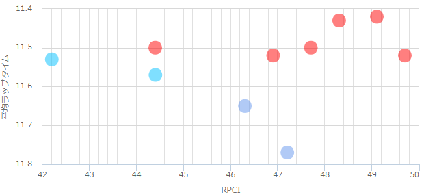 RPC47~49くらいのややハイペースになる傾向で比較的直線の勝負になることが多い。