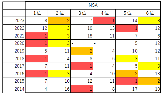 今年NSA値が高いのはマスクトディーヴァ(129)テンハッピーローズ(128)、ナミュール(126)、フィールシンパシー(125)、モリアーナ(124)、フィアスプライド/ドゥアイズ/ウンブライル(123)です。