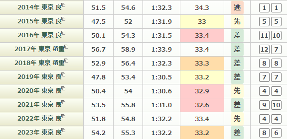 上がり3ハロンのタイムは32.9~33.4秒くらいの早いタイムが必要でどのペース・タイムでも3ハロンタイムが早い馬が勝つ傾向が強いです。