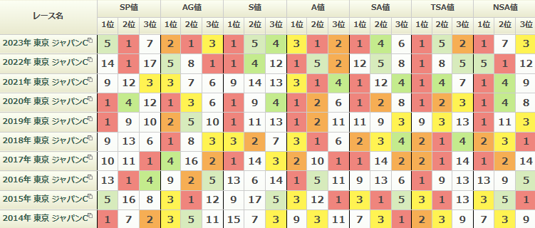 今年TSA値が高いのはチェルヴィニア(94)とソールオリエンス(94)とドウデュース(93)、スターズオンアース(92)、ジャスティンパレス(90)