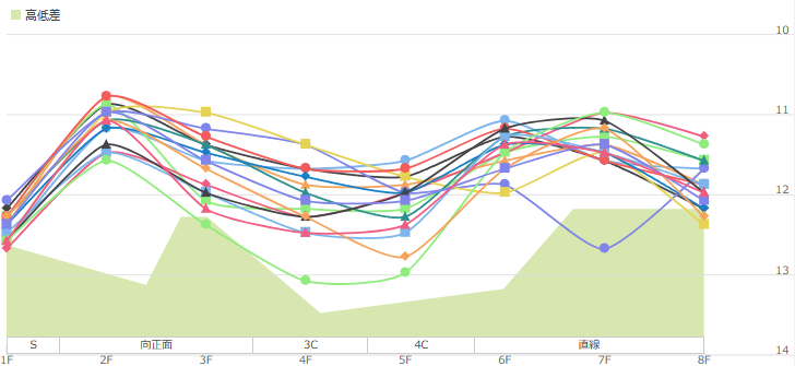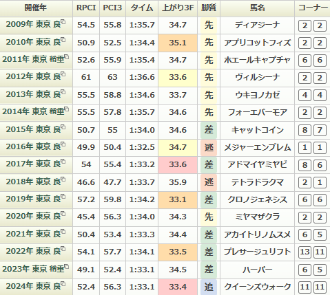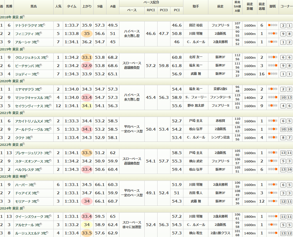 息の入りづらい展開になることが多く、上り3Fの最速タイムは33秒5くらいになることが多い。