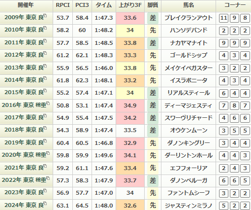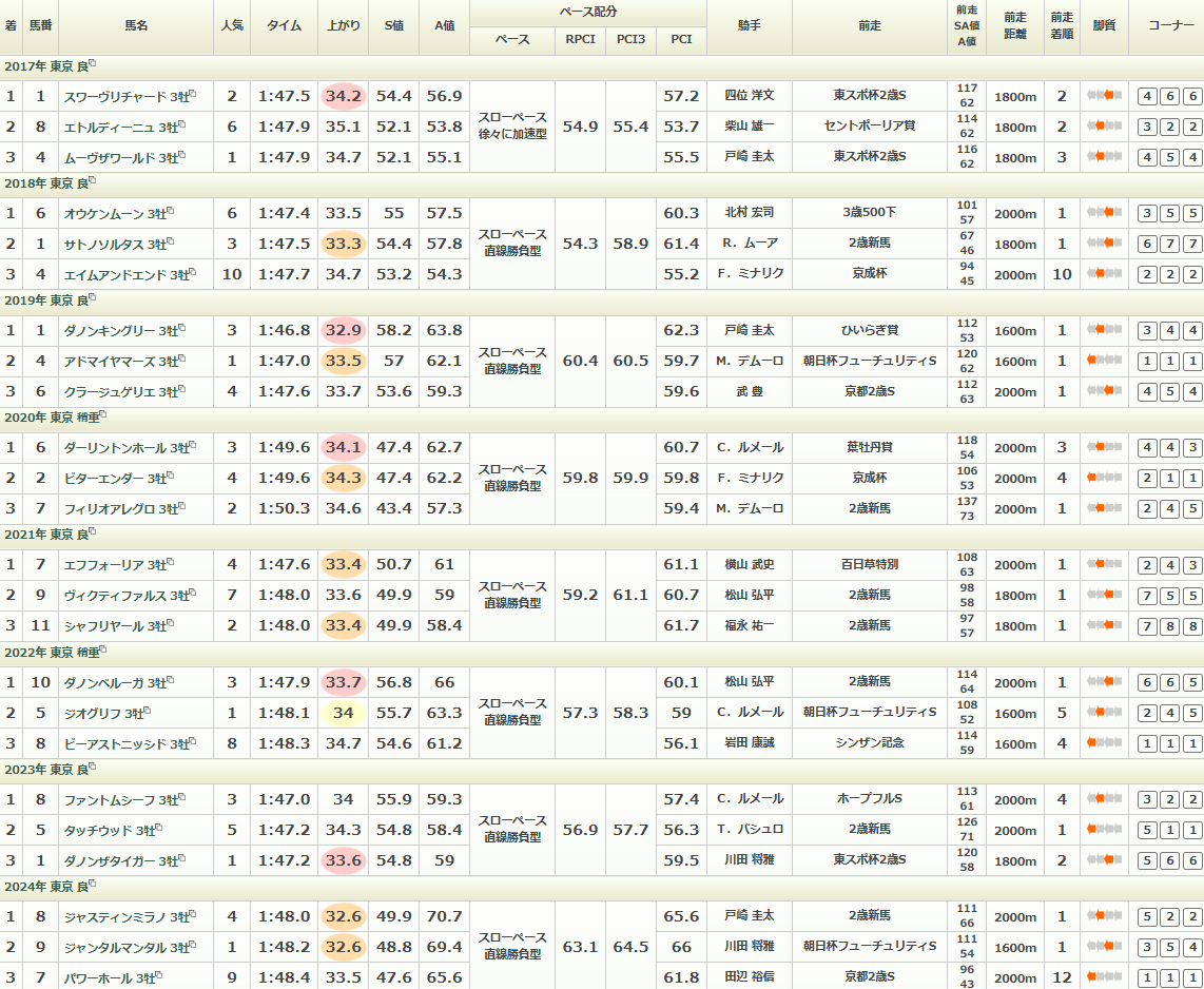 勝利馬は御覧の通り錚々たるメンバーで、2~5番手で進めて速い上りが使える馬が勝つケースが多い。