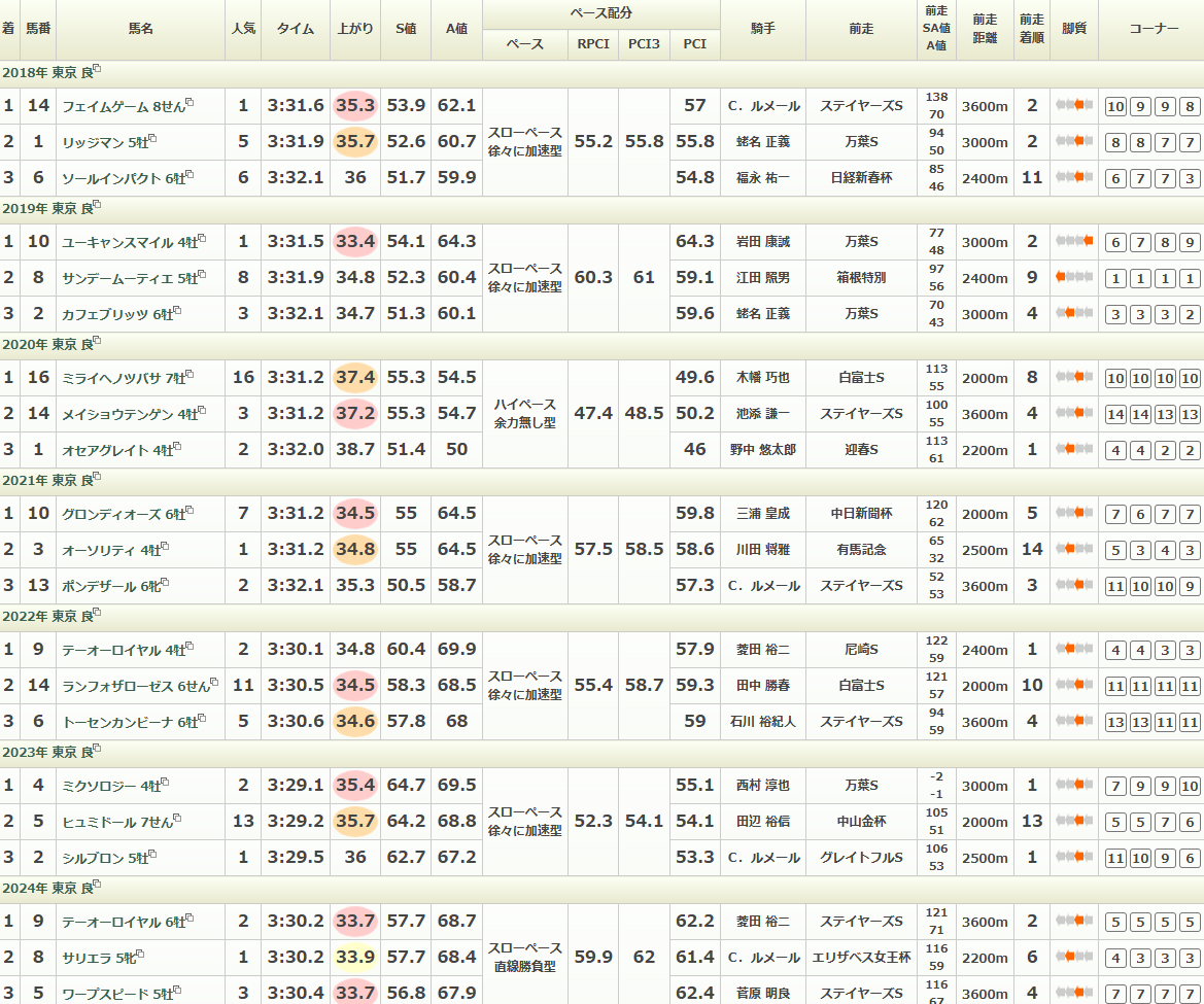 穴馬だけを見てみるといずれも前走2000mからの参戦が目立ち、前走2000mからの距離延長組を狙うのも面白そう。