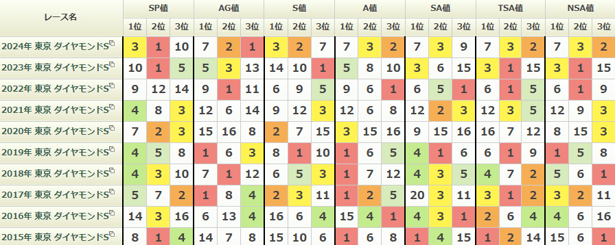 今年数値で良いのはTSA値、SA値1位、SP値2位のコパノサントス、A値、NSA値、SP値1位、SA値2位のワープスピード、