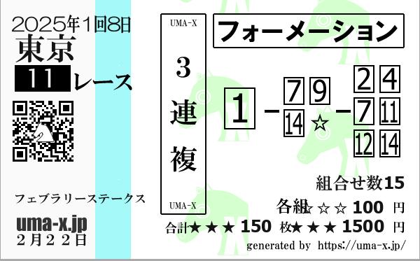 前走は根岸Sに出走し7番手からの競馬で2着に0.7秒差で圧勝。 東京では5戦5勝と無類の東京巧者。 騎手はR.キング騎手に乗り変わりとなるが過去騎手変更時は全て勝利していて影響はなさそう。