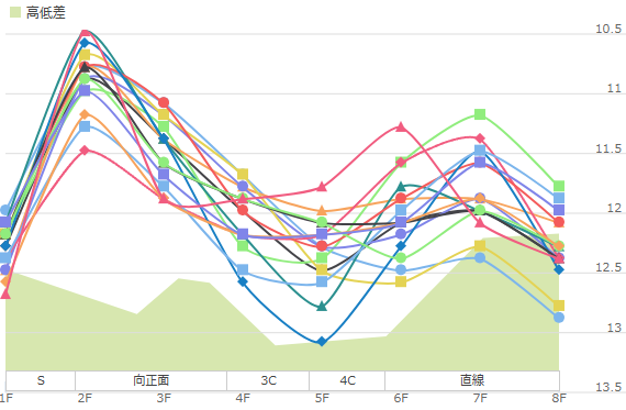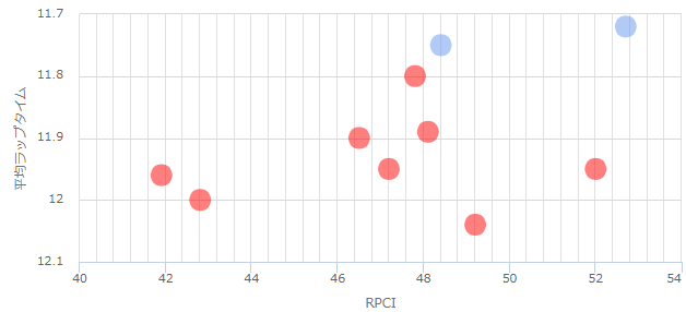 基本的にはRPCI47前後のややハイペースくらいで、レースタイムは1分35秒2前後になることが多い。