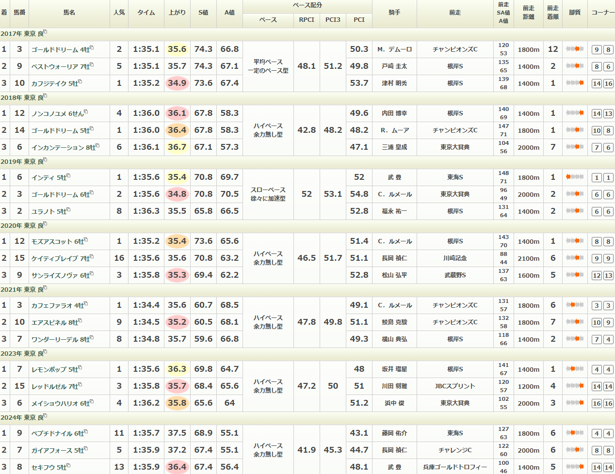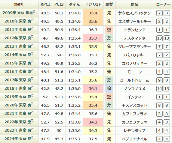 勝馬の履歴を見てみると先行馬が有利になり易く、ここ4年は3~4番手で進める王道競馬での勝利が続いている。