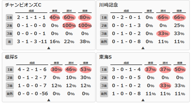 前走ダート重賞戦での1着馬の活躍が目立ち、根岸Sや東海S、チャンピオンズC、川崎記念などからのローテーションで活躍する馬が多い。