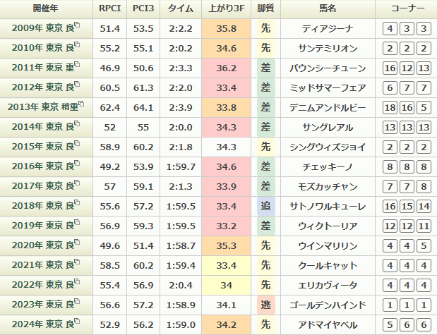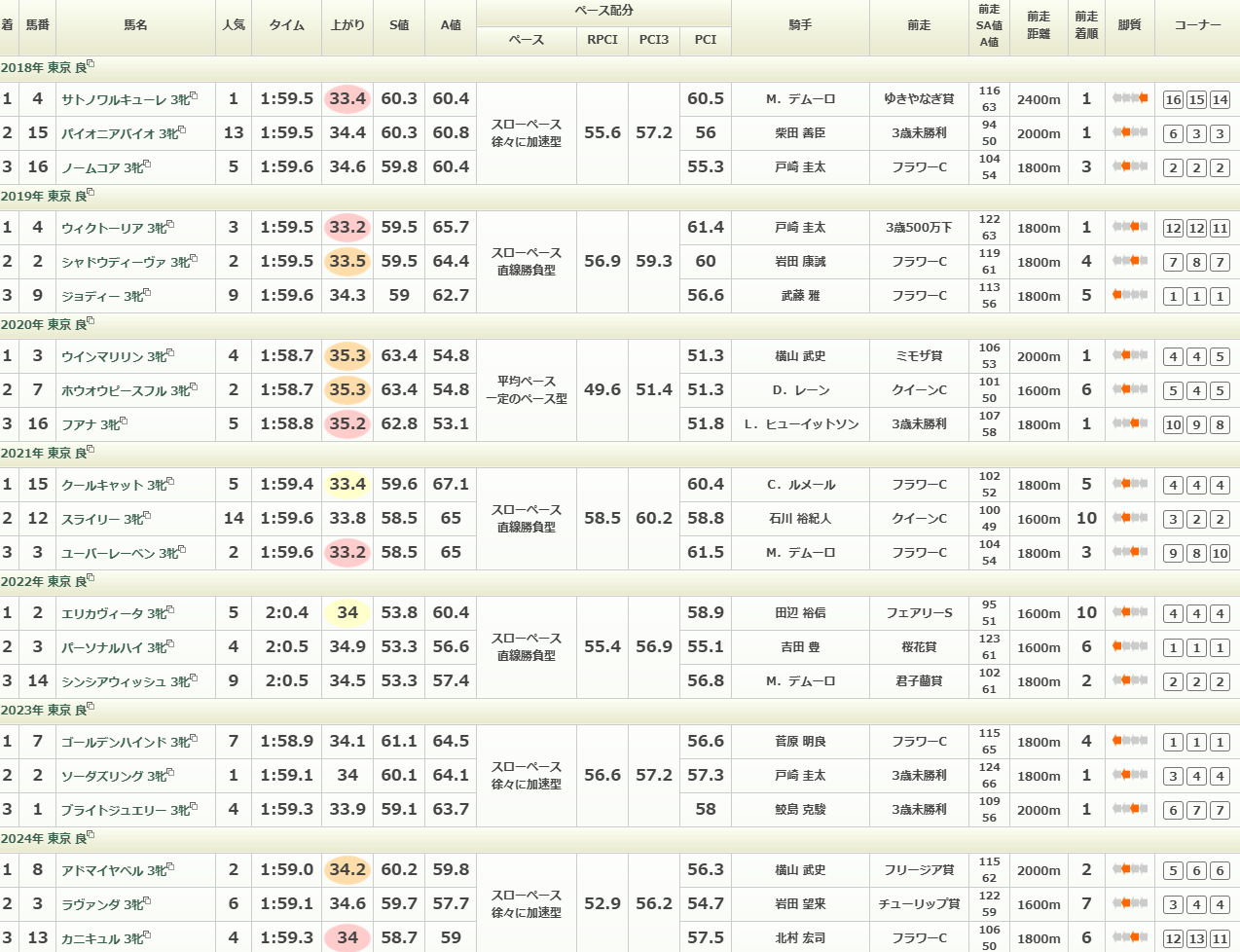 ここ3年は上り3Fのタイムが34秒台のスローペース展開が続いていて、前が有利になっている。