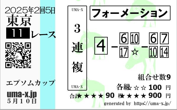 前走は小倉日経賞に出走し、5~6番手の競馬で1着。2走前は12番手の後方からの競馬で11着と大敗しています。 S値が60を超えた時に負けていて、速いタイムになるようなレースは少し苦手かもしれません。 今回は稍重くらいの開催になると時計がかかるようになり、稍重時の数値や成績も良いので展開が向き易そうです。 上り3Fが速く、多くのレースで上り最速が2位のタイムで走っていて、エプソムCの傾向には合いそうです。 ルメール騎手に乗り変わりになるのはプラス材料だと思います。
