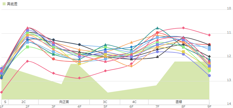 ペース配分はスタート直後の下り坂でやや早いペースになりますが、ずっとラップタイム11秒台くらいで淡々としたペースになることが多いです。