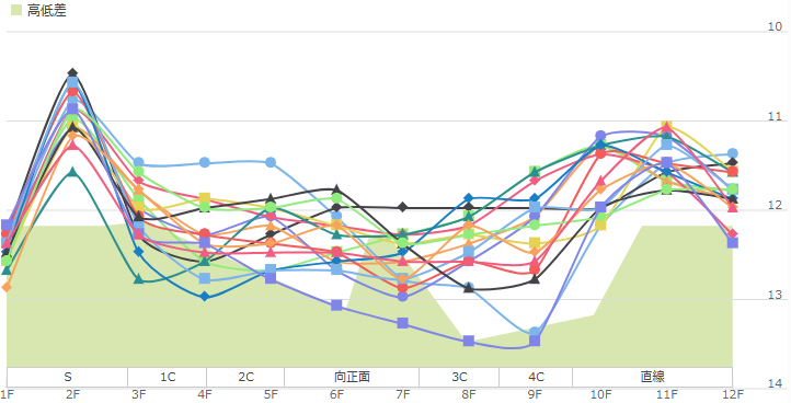 息が入らずずっと速いペースが続く消耗戦のようになる場合と息が入り直線勝負になる場合の2パターンがありずっと早めのペースになるケースが多いようです。