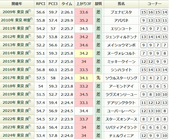 オークスで稍重より馬場が重くなったのは2010年まで遡り、この時は2分29秒9、上り35秒2とかなり時計がかかっています。
