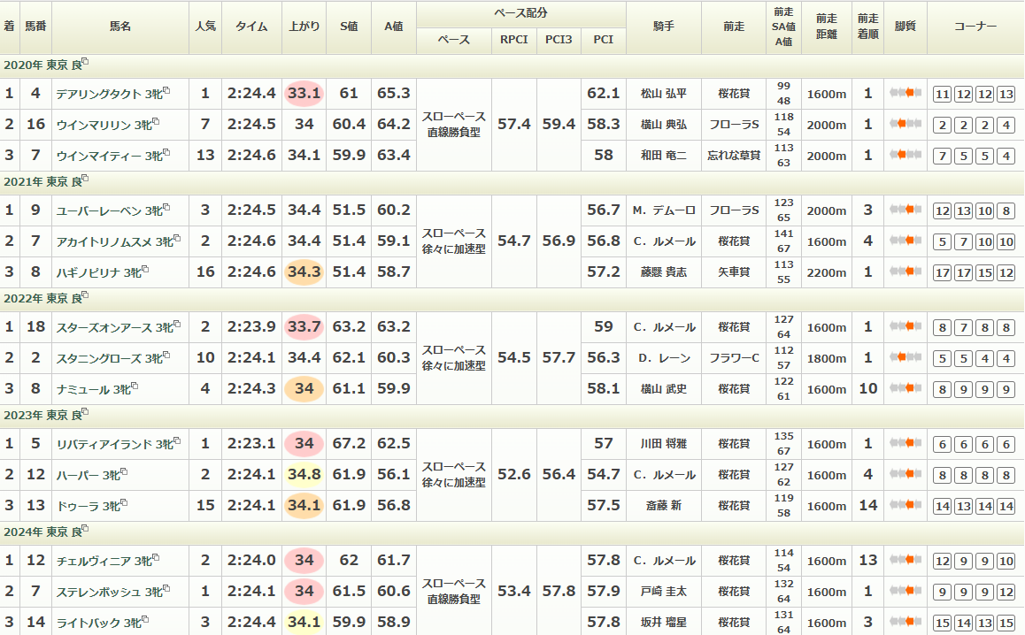 逆に言えば前からの競馬で馬券に絡むケースが少なく、特にここ3年はほとんど差し競馬で上位を占めている印象です。