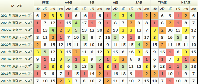 前走はフローラSに出走し9番手からの競馬で上り3F33秒4で勝利しています。 1600m戦では2戦してどちらも馬券に絡めていないので、距離は長い方が良いように見えます。 前走距離延長+シュタルケ騎手騎乗で実績を出せているので、今回も期待できそうです。 AG値とA値が高く、オークスの傾向には合いやすいと思います。
