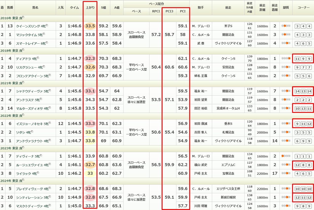 過去の良馬場時開催の府中牝馬Sの傾向を見てみますと、上り3Fが32秒台になることが多いことが分かります。