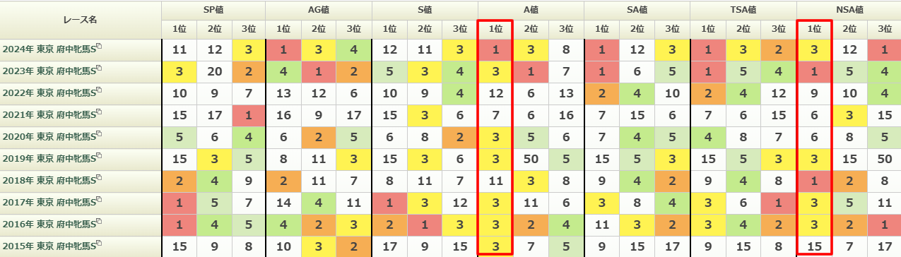 他にはSA値1位、TSA値2位のフィールシンパシー、A値・NSA値2位でTSA値3位のタガノエルピーダ。