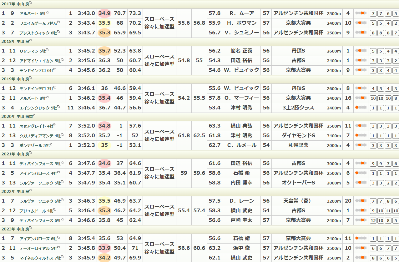 今年は1年半の休養明けでオールカマー、アルゼンチン共和国杯で2戦とも二桁着順と大敗している。 その前2戦は3000m戦でどちらもレコードタイムで勝利していて、長距離戦で無類の強さを誇る。 鞍上も西村騎手に戻り万全の態勢のように見える。