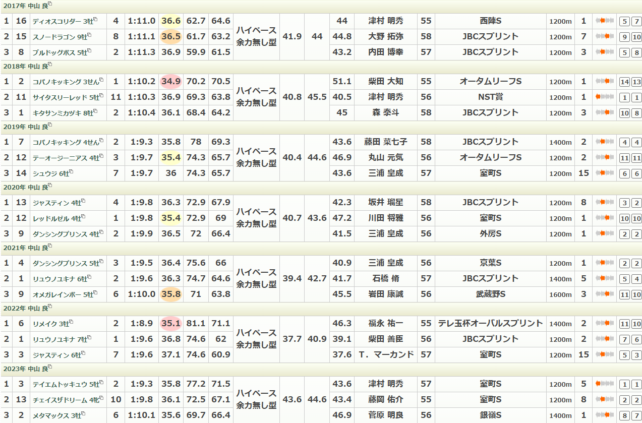 室町S、JBCスプリントからの出走が目立ち、ローテ的に1か月くらいの間隔を開けている馬が活躍しやすい。