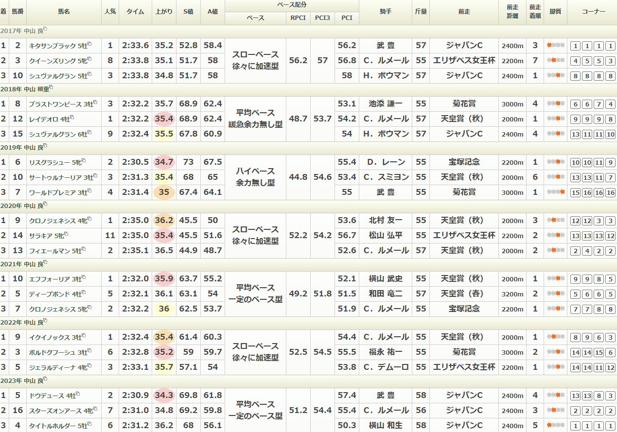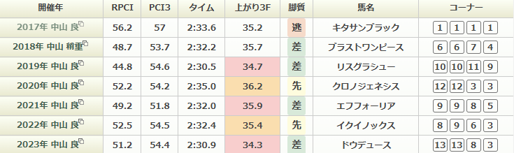過去6年は上り最速馬と2位の馬の活躍がとても目立つ。2017年はスローペースとなりやや前残り気味な展開となっていて、去年もその傾向が強い。