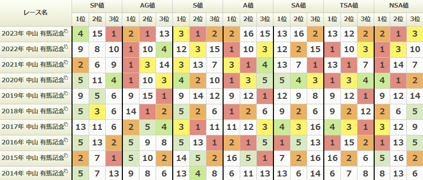 数値の相関関係は強めで、ここ4年くらいはAG値やA値の1位の馬が良い結果に繋がっている。