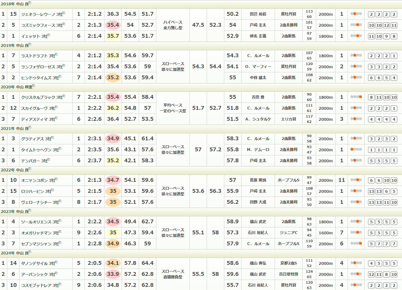 レースタイムは2分1秒3前後になり、上り3Fの末脚勝負になることが多い。
