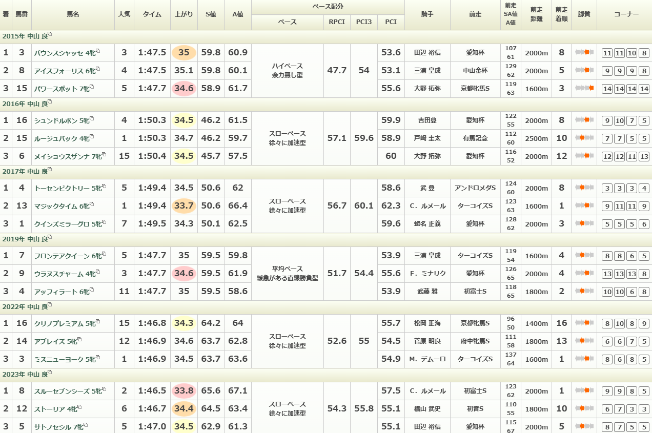 良馬場開催の中山牝馬Sで傾向を見てみると、上り3Fの速い馬はそこまで多くない。