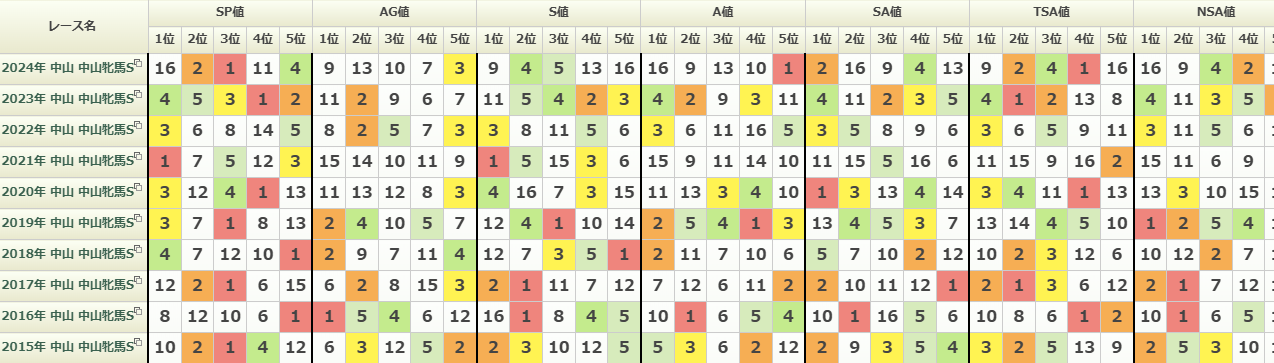 数値の相関関係はかなり低め。SP値はそこそこ絡むことが多く、過去10年でSP値が色付きの馬が9回勝利している。