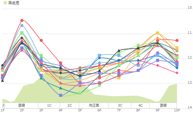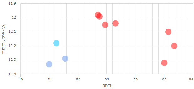 稍重~重馬場の時はRPCI50くらいの平均ペースになり易く、レースタイムは2分2秒0前後になりそう。