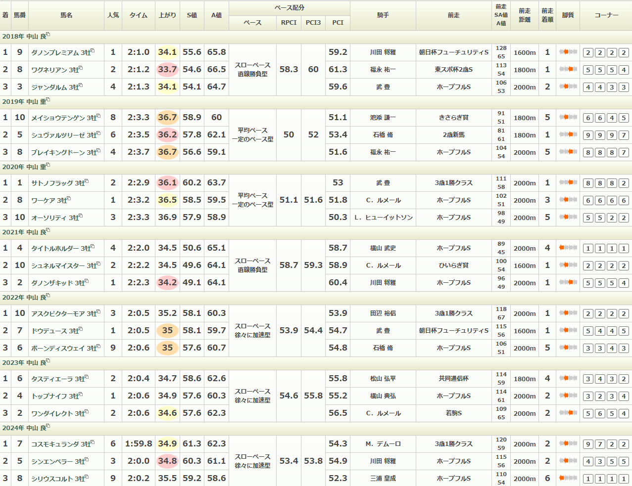 良馬場まで禍福した場合は2分0秒0くらいのスローペースになり易く、馬場の状態は要チェック。