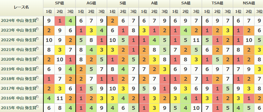 TSA値1~4位で1~3着を占めたのが10年中4回、NSA値とA値は1~5位の馬が1~3着を占めたのが4回ある。