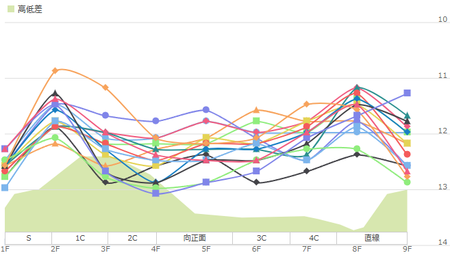 最終コーナーで10番手より後ろからの馬は馬券に絡んでいないので後ろからの馬には厳しい展開になりそう。