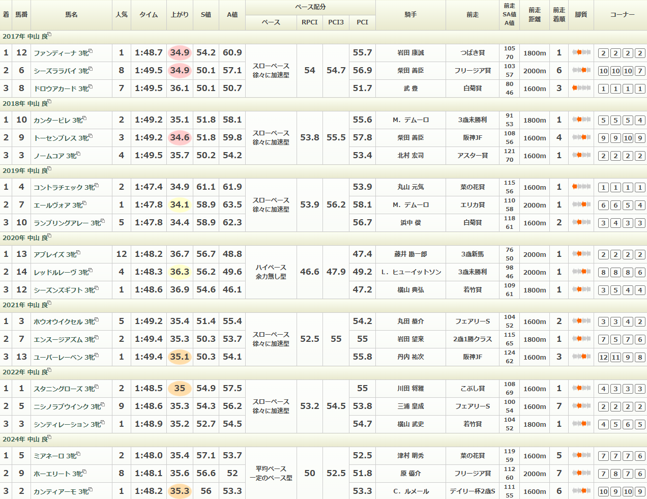 とはいえ、上り最速馬はそれほど馬券に絡んでいないので、前からの競馬で持続スピードがあるタイプが良い。
