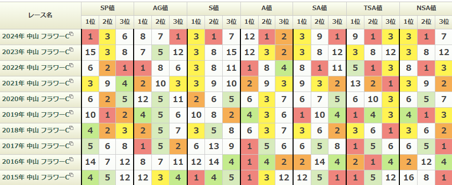 数値の相関関係はボチボチ。TSA値3位までの馬が過去10年間で8度1着になっている。