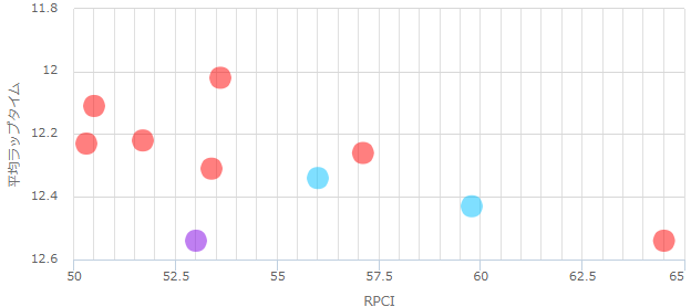 スローペースになるとPCI3が56を超えるケースが多く、平均ペースだと53前後になる。