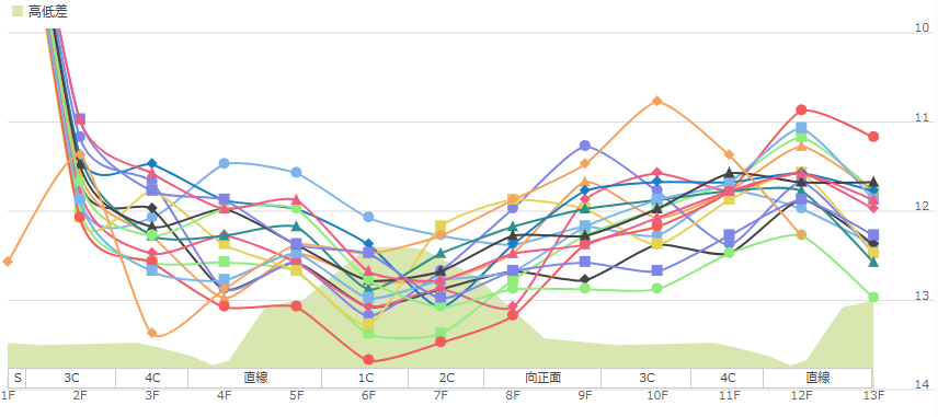 ペース傾向は良馬場時はRPCI51前後になることが多いが、稍重時はRPCI56~59になる。
