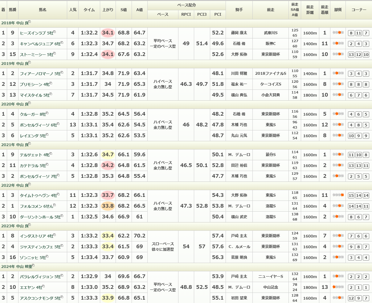 そこから直線まで続く坂でペースが落ちることが無く直線に入り、ゴールまで速いペースが続く息の入りづらいレースとなりやすい。