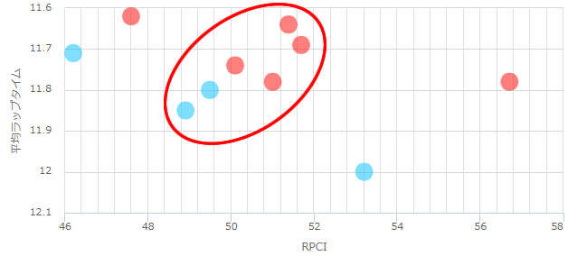 良馬場開催時はRPCI51くらいの平均ペースになることが多く、稍重の場合はRPCI48前後のややハイペースになりやすい。