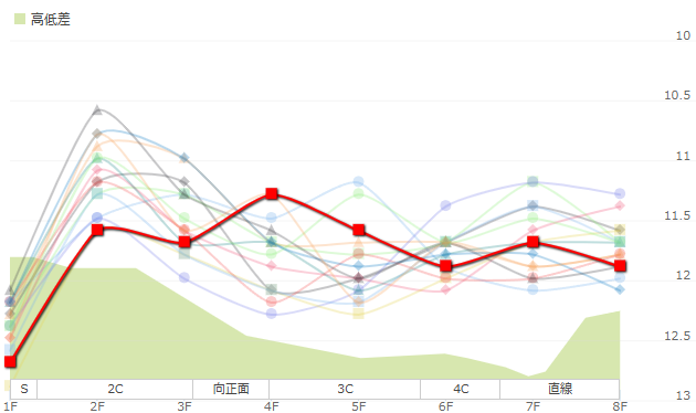 ここ数年のペース配分はグラフのようにずっと11秒台のペースが淡々と続くような流れが多く、持続力勝負になりがち。