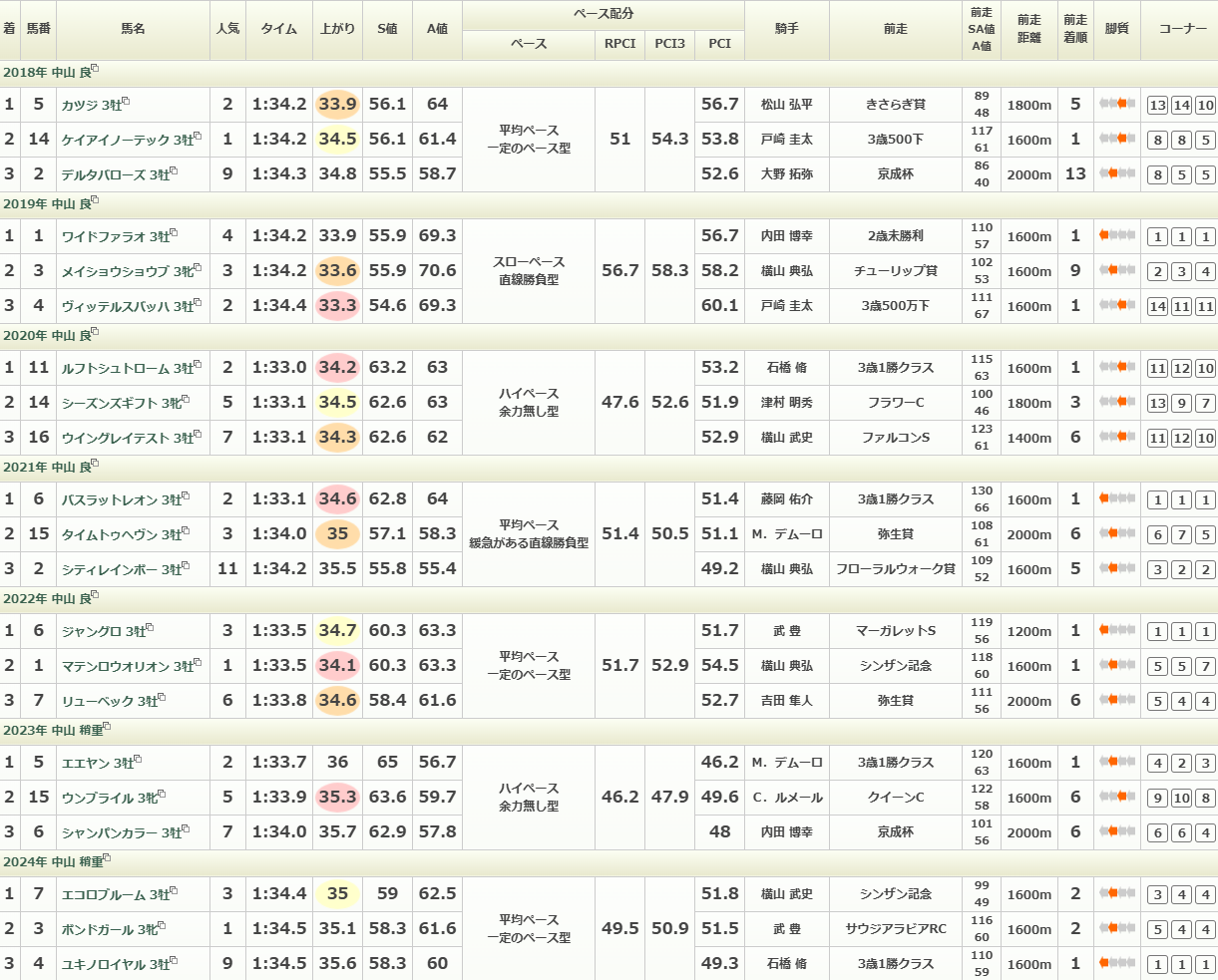 ここ2年は稍重でのレースになり上り3Fのタイムが35秒台の馬達が馬券に絡んでいる。