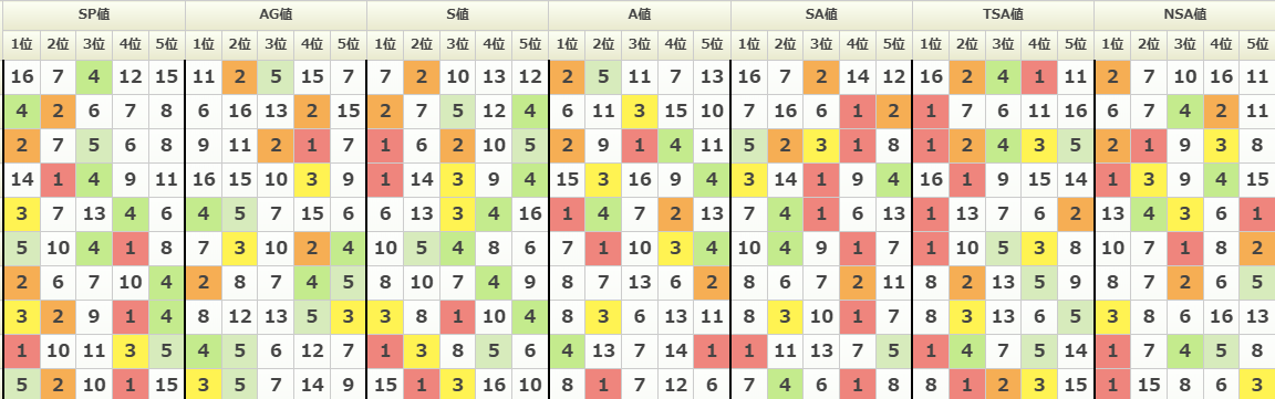 次いでS値1位、TSA値2位のムイ、SP値・AG値1位、A値・SA値・NSA値2位、TSA値3位のイミグラントソング、