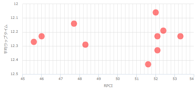 レースタイムも1分48秒5~1分51秒9まで幅があり、平均すると1分50秒1くらいのタイムになりそう。