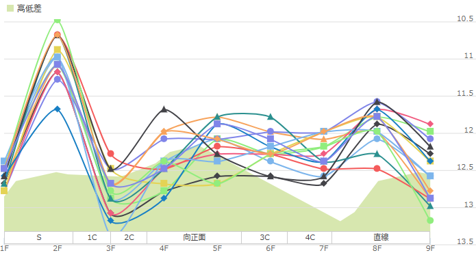 S値が70以上になるようなハイスピードレースになることが多く、1分50秒0前後のタイムになることが多い。