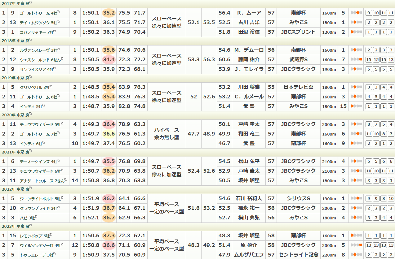 向こう正面の下り坂からペースが上がり、そのまま5ハロン速いペースのままゴールまで駆け抜ける展開が多い。