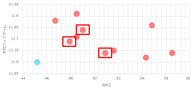 ラップ傾向はRPCI48~50くらいの平均ペースくらいになり、レースタイムは1分33秒5前後くらいになりそう。