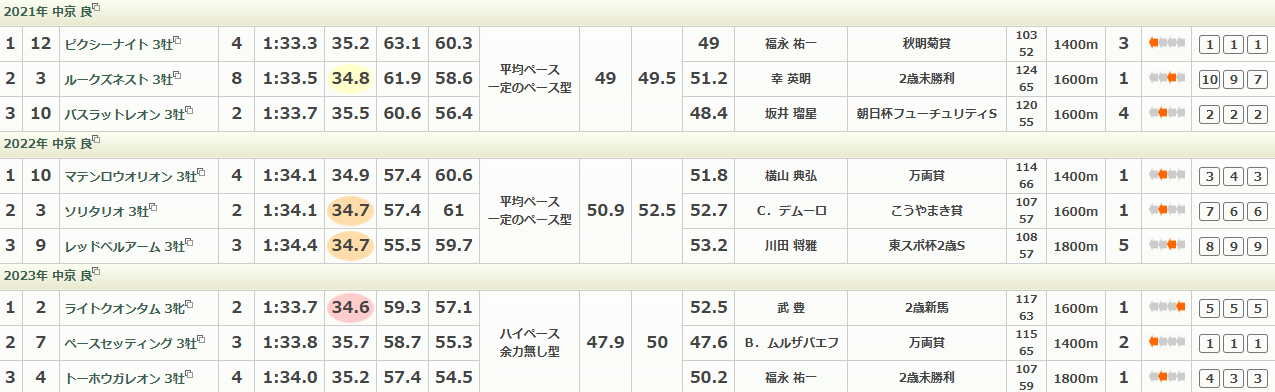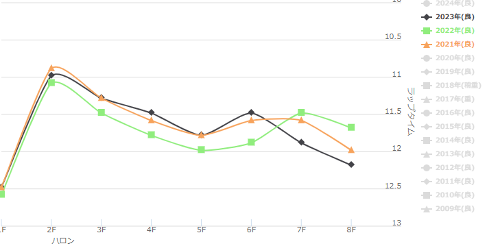 2021~2023年の中京開催のシンザン記念を参考とすると、末脚はそれほど目立たない。