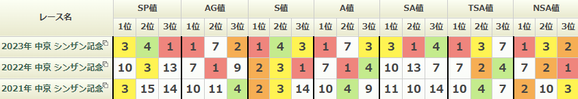 2021~2023年の中京開催のシンザン記念の3レースの数値を見るとS値とNSA値の相関関係が強い。