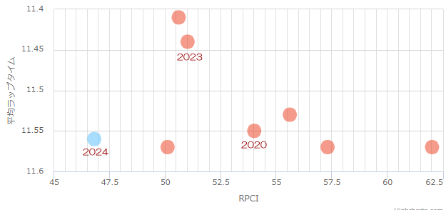 最近はRPCIが46前後になるようなハイペースの消耗戦になることが多かったけれど、今年はメンバーが揃わずRPCI50くらいの平均ペースになりそうな予感。